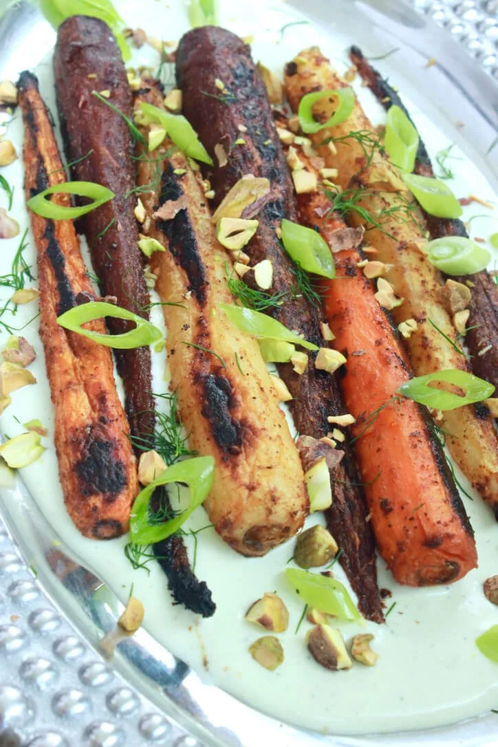 - Spoon whipped feta on dish and place carrots on top. Option to garnish with chopped pistachios, fresh dills, and sliced green onion.